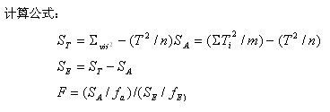 設yij為方案i(i=1、2、3)下第j(j=1、2、3、4、5、6、7、8、9、10)個試樣的測試結果,Ti為方案i下數(shù)據(jù)和,T為總和,ST為總離差平方和,SA為因子(方案)的離差平方和,SE為隨機誤差的離差平方和,fT、fA、fE分別為ST、SA、SE的自由度,r為方案數(shù),m為每一方案下進行的試驗次數(shù)。